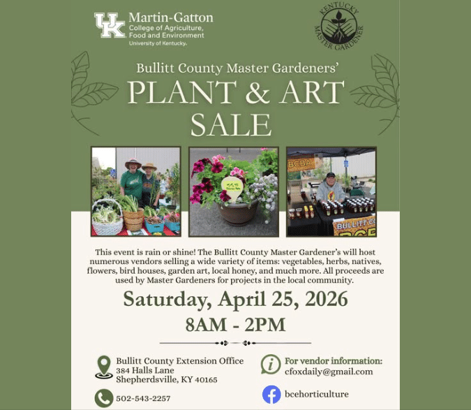 Mark your calendars! The Bullitt County Master Gardeners’ annual plant sale will be held on Saturday, April 25th from 8am-2pm. Come out and shop, browse through plants and garden art, chat with Master Gardeners, and check out all of our great vendors! For questions, call 502-543-2247.