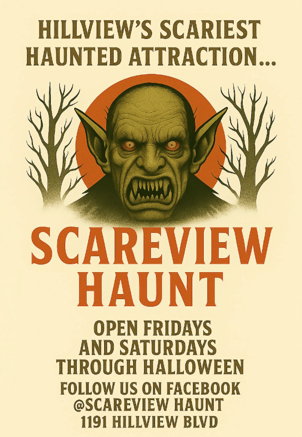 Home Events Calendar ScareView Haunt ScareView Haunt Scareview Haunt is Open! Lights On Hour (Family-friendly, no scares) 5 PM – 6 PM | 5 Haunted House (Full scares!) 6 PM – 12 AM | 15 Open TONIGHT & TOMORROW …and every Friday & Saturday through Halloween! 1191 Hillview Blvd Follow us on Facebook: @ScareviewHaunt Come if you dare… Date Oct 31 2025 Expired! Time 5:00 pm - 12:00 am More Info Read More Location 1191 Hillview Boulevard, Louisville, KY 1191 Hillview Boulevard, Louisville, KY Share this event X